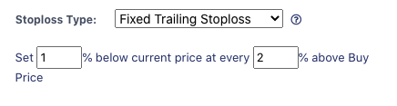 Based on the example above, this means the stop loss level will be set at 1% below the current all time high price of the asset if the latter's price appreciates 2% above the Buy Price. For every 2% above the Buy Price, the stop loss level inches upwards to 1% below the latest price jump interval. The Fixed TSL is immediately set when the bot opens a deal.